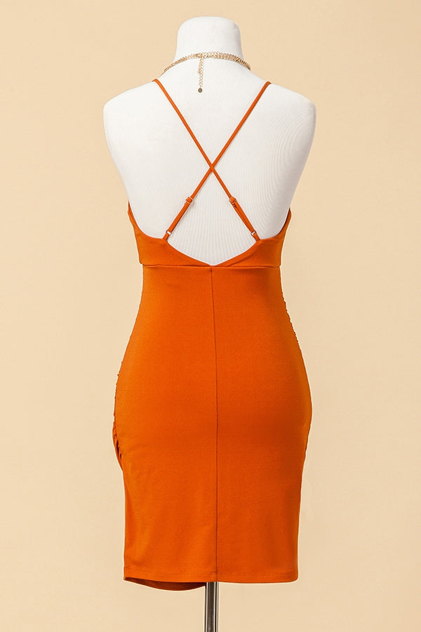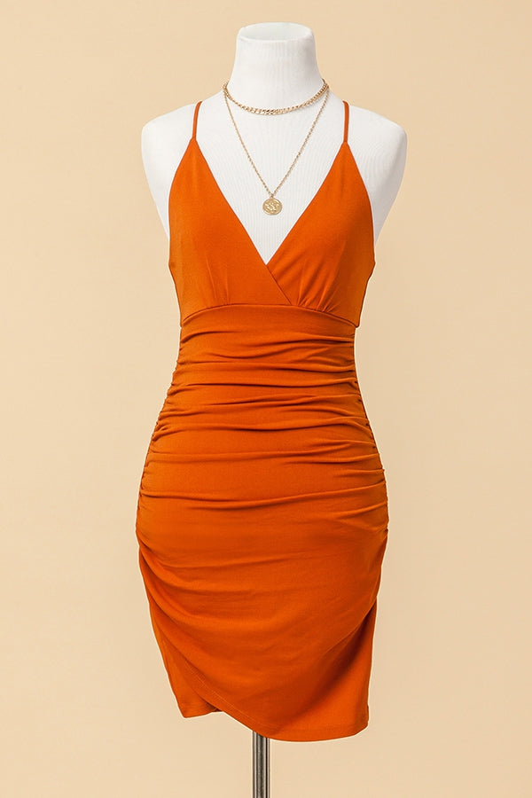 V-NECK RUCHED BODYCON MINI DRESS